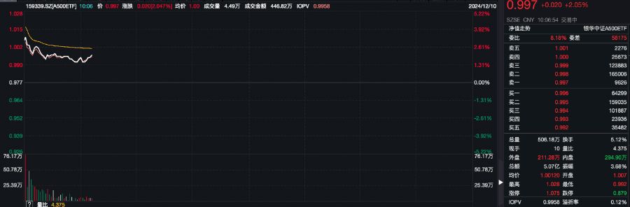 关连ETF方面,A500ETF(159339)解懒散稿涨2.05%,成交额超5亿元,换手率5.12%,早盘交投活跃,溢折率0.12%,盘中频现溢价来回。Wind金融末端数据露馅,终结12月9日,该ETF最新范围96.55亿元,最新畅达份额98.81亿份。